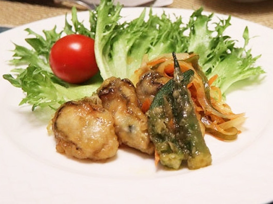 牡蠣は40秒~1分、オクラは表面がカラッとなるまで揚げ、ざるに移し油切りをします。 - (10)を(8)のバットに入れ上から野菜をかぶせます。粗熱が取れたら冷蔵庫で冷やし完成です。