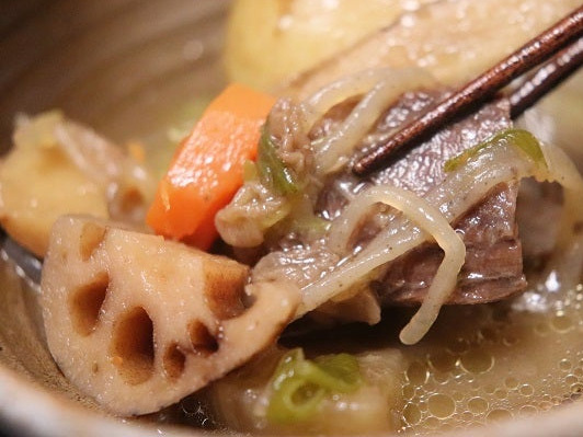 - (3)と別の鍋に、牛すじ、牛すじが浸かる量の水(分量外)、(1)のしょうが小1カケ分を入れ強火にかけます。沸騰したらあくを取り除き、蓋をして弱火に下げ、1時間下茹でします。鍋の状態を見ながら、ゆるく煮立っている状態を保つように、火加減を調節してください。