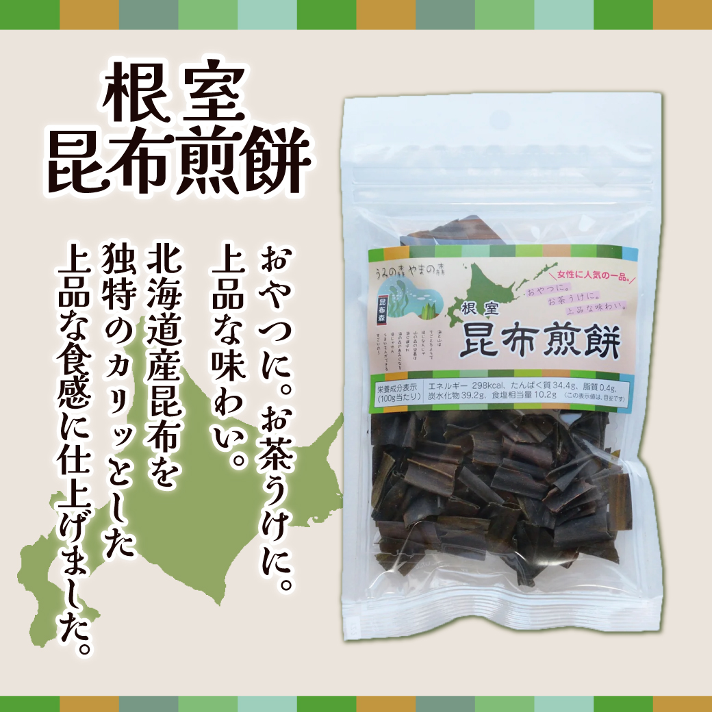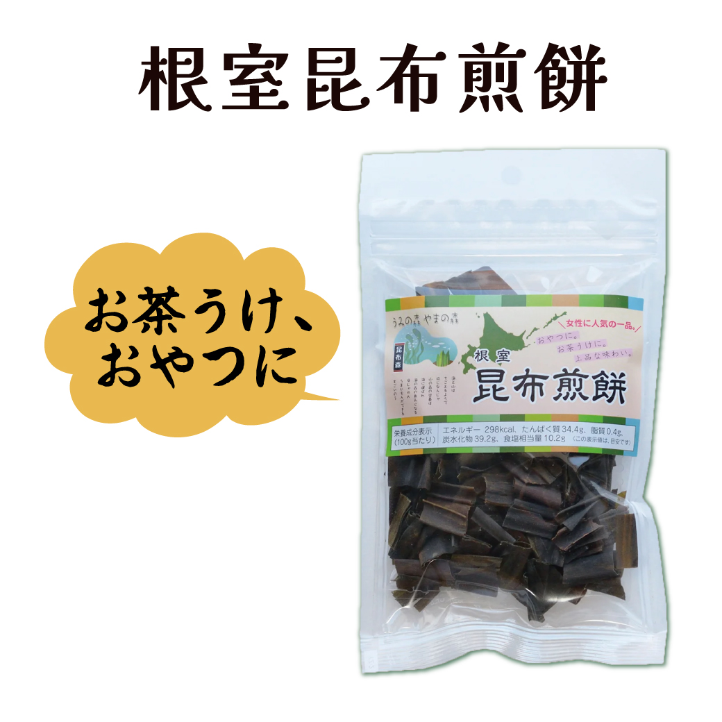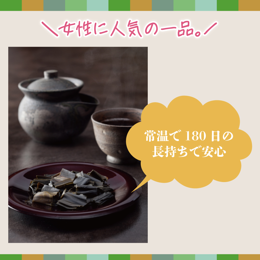 昆布(北海道産)を独特のカリッとした上品な食感に仕上げました。お茶うけ、おやつに人気です。